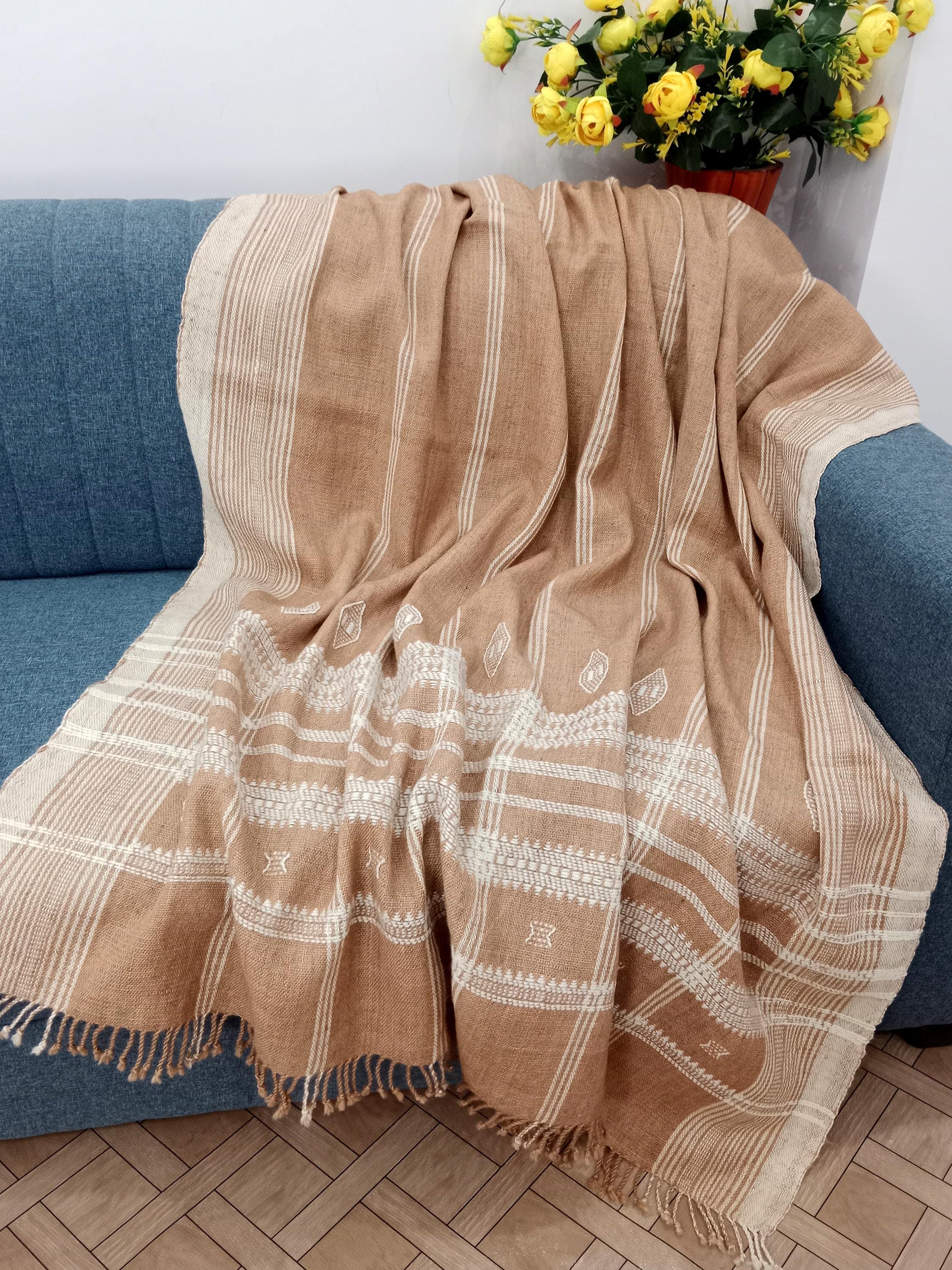 👉The wool is hand-spun, dyed and woven on pit-looms, to create earthy but sophisticated scarves, shawls, blankets and carpets. Products are often subtly embellished with touches of hand-embroidery or mirror-work. The same traditional motifs are still embroidered on the shawl that are characteristic of the community.