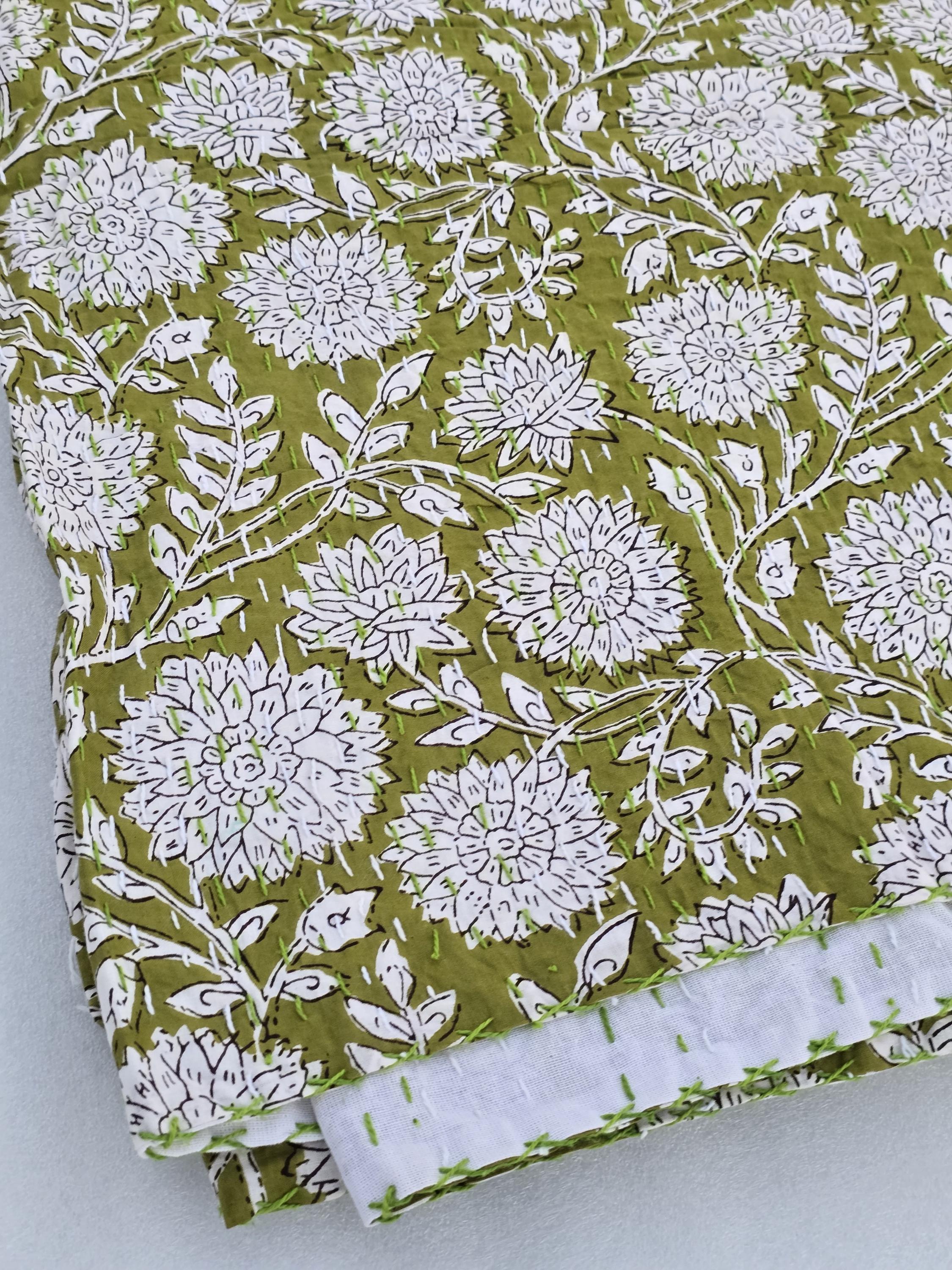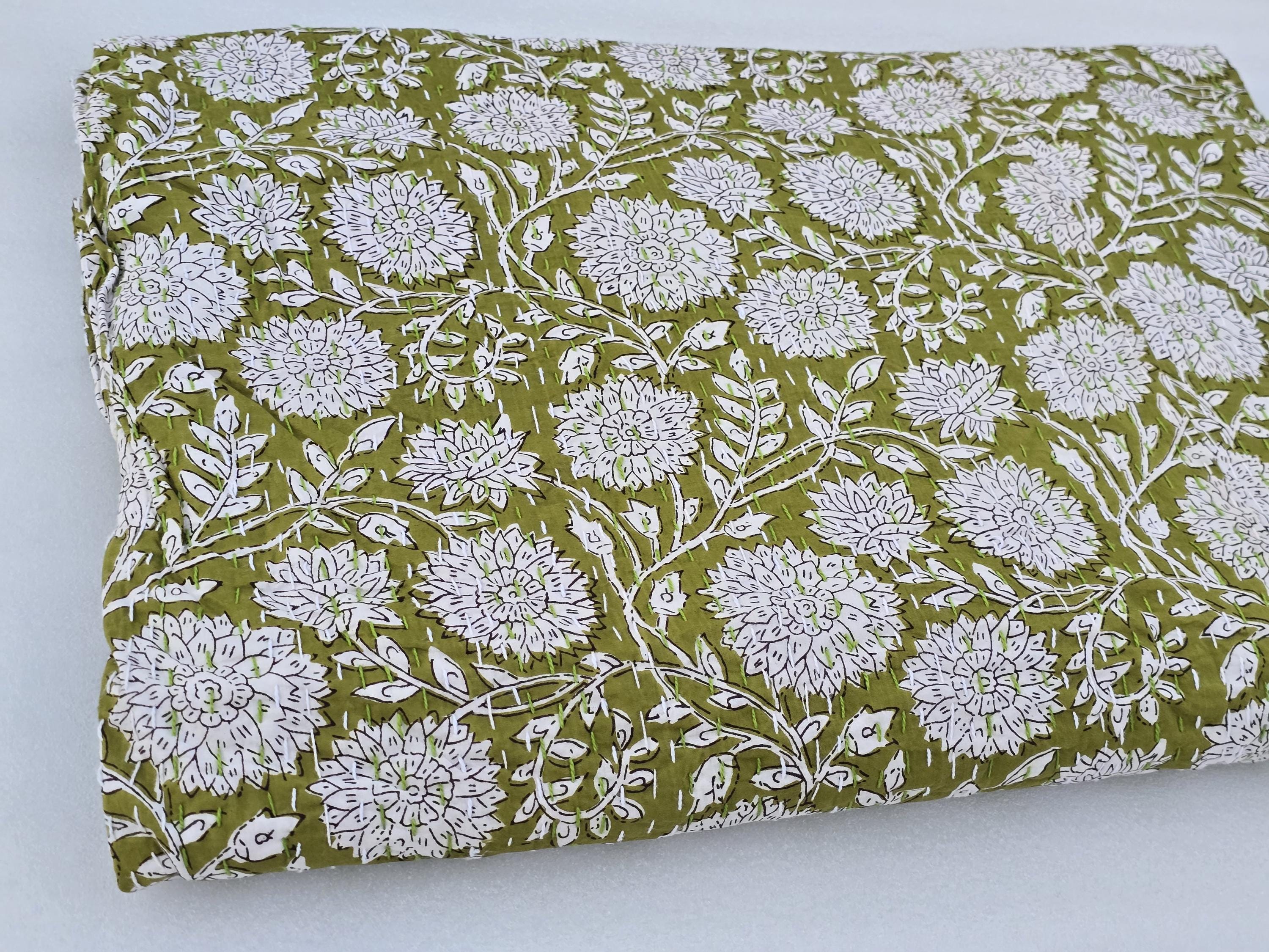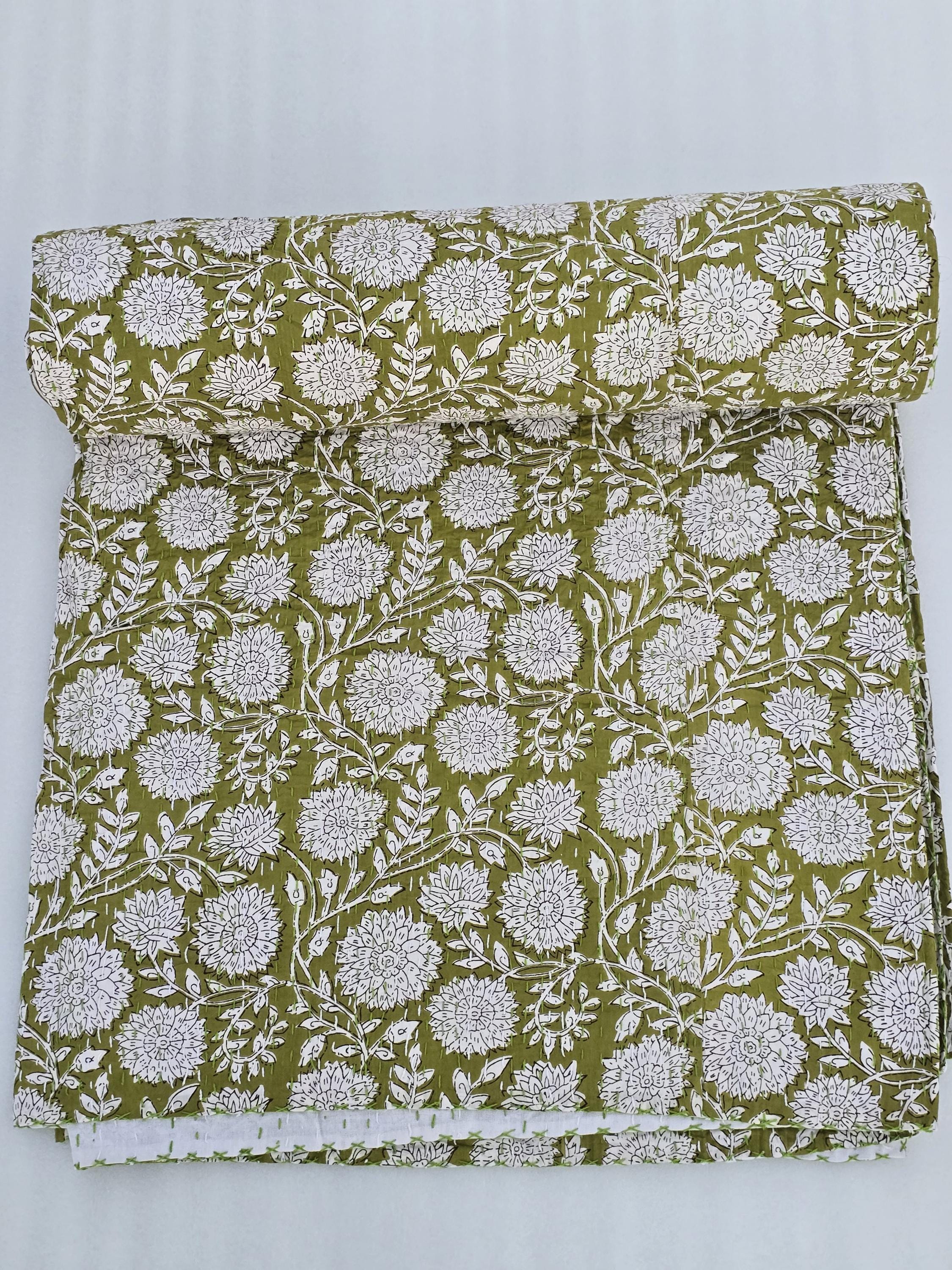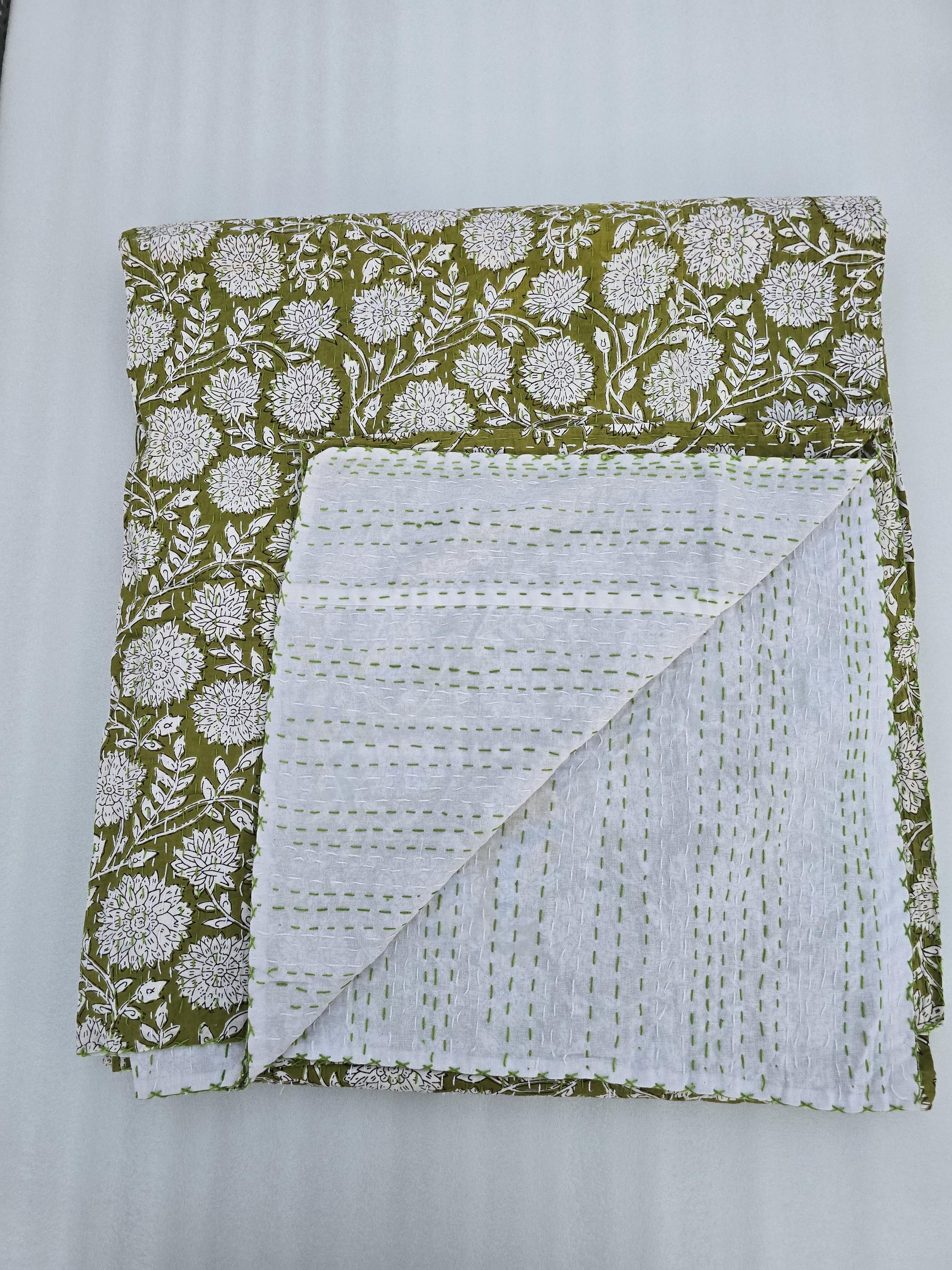 Premium Handmade Kantha Bedcover, Hand Block Floral Print Quilt Lightweight Kantha Throw, Pure Cotton Bedcover, Housewarming Gift