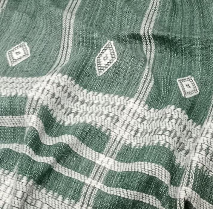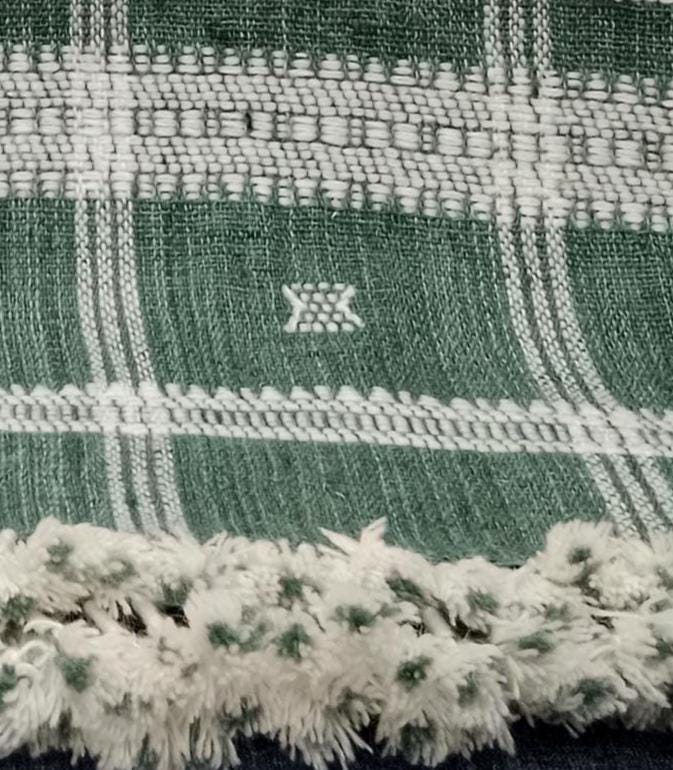 👉The wool is hand-spun, dyed and woven on pit-looms, to create earthy but sophisticated scarves, shawls, blankets and carpets. Products are often subtly embellished with touches of hand-embroidery or mirror-work. The same traditional motifs are still embroidered on the shawl that are characteristic of the community.